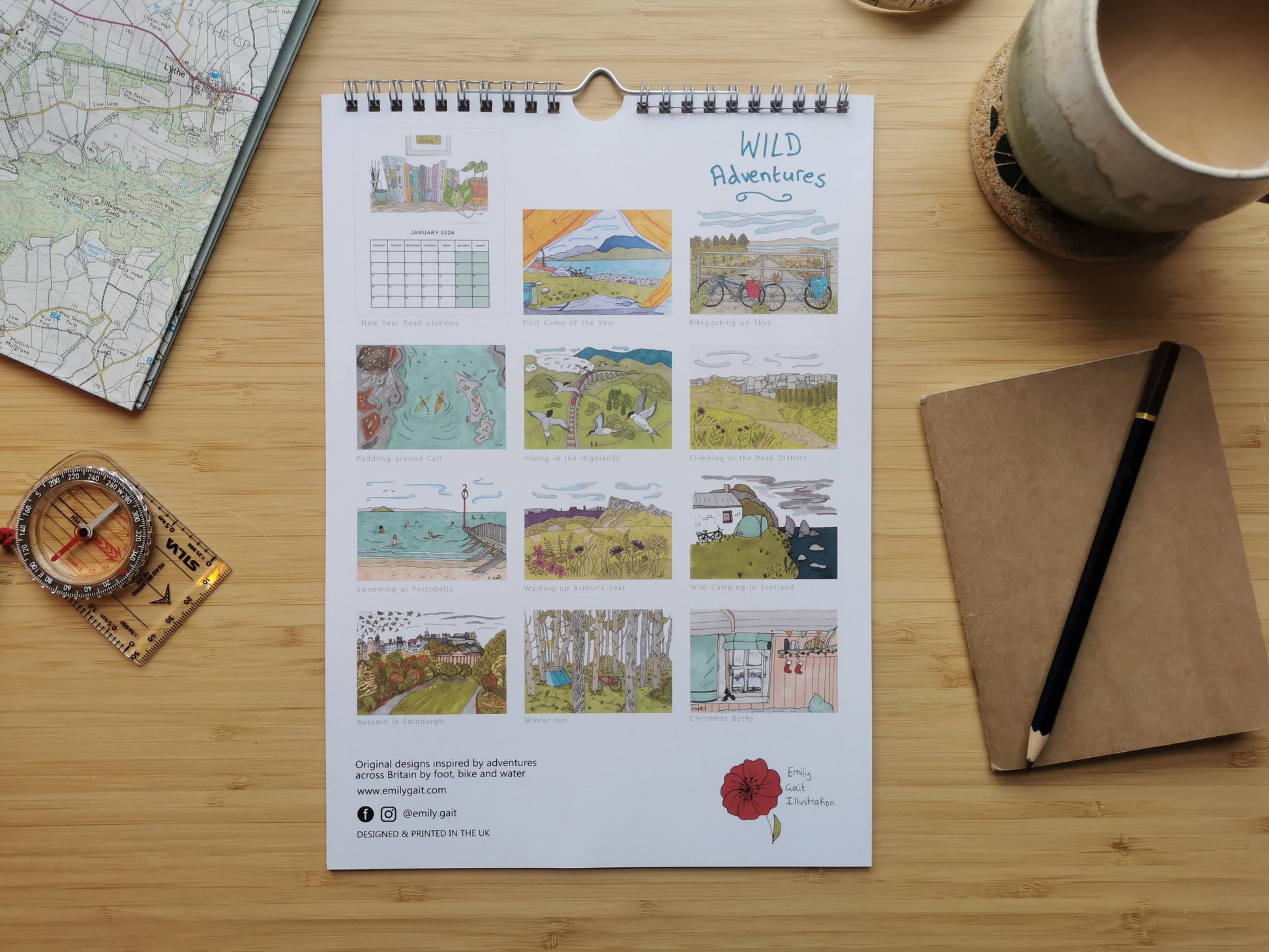 A4 Hanging Wall Calendar. 12 prints from my original illustrations of wild adventures throughout the UK.