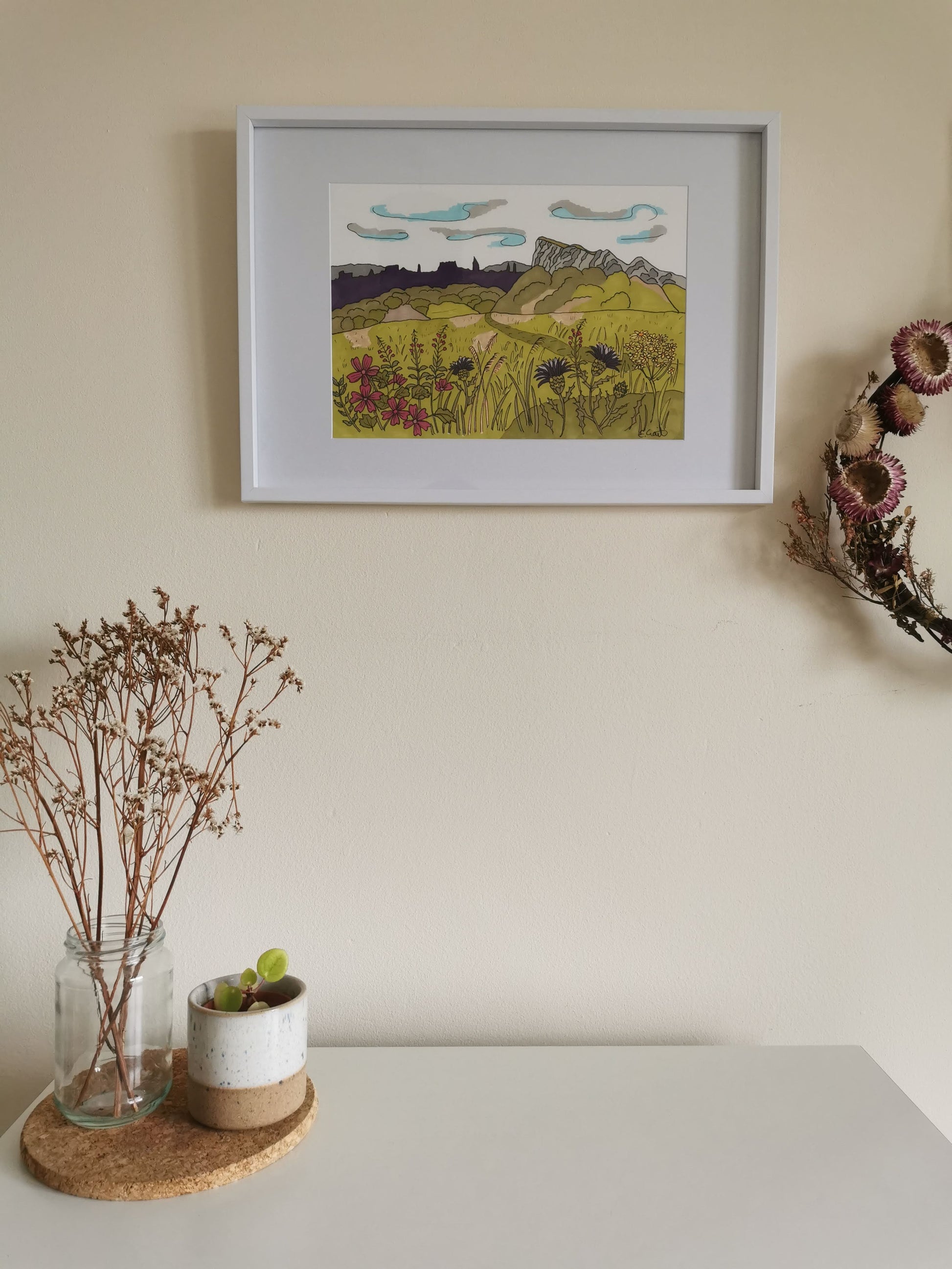 High quality Giclée print created from my original pen and ink illustration of Salisbury Crags, at Arthur's Seat with the city of Edinburgh in the background.